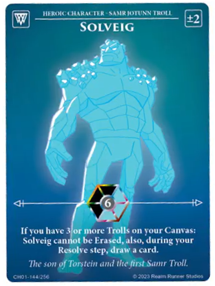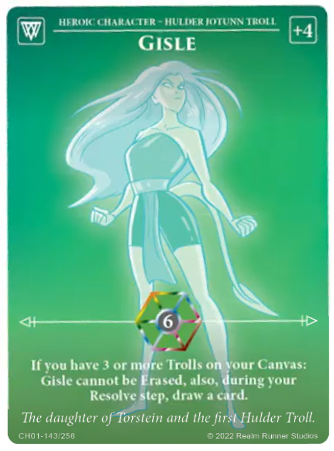 Gisle (pronounced Gees-le) and Solveig previously had their gain/steal tied up in their “3 or more trolls” ability, meaning that often they would cost 6 shards for essentially nothing but a 6 strength character, which was terrible value. Now their resolve happens regardless, these characters are much more playable. Good change.