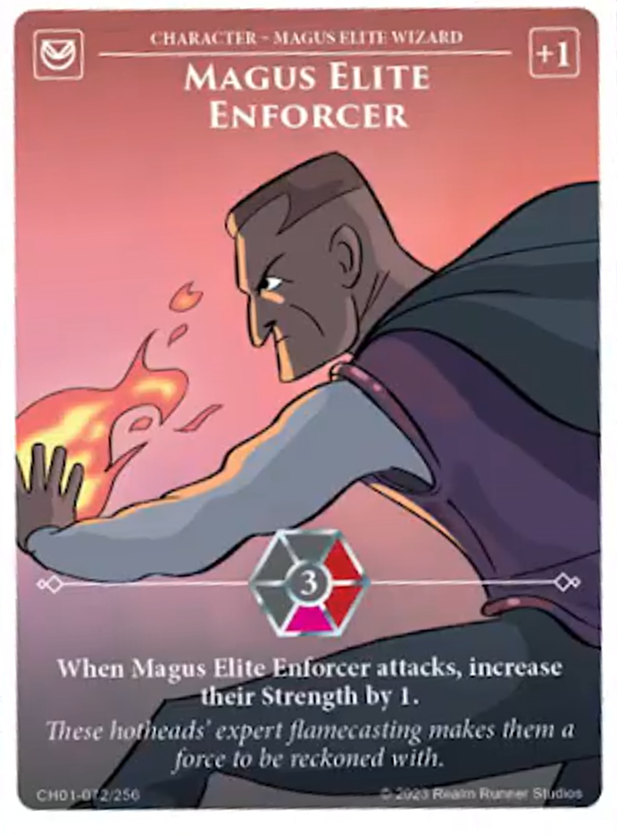 Magus Elite Enforcer has undergone a subtle change to increase their strength rather than shard value by 1 when attacking. In practical terms, now you can erase a 4 strength character with them, but if you attack a 3 strenth character the Enforcer will now be erased. I find this change a little strange. I understand this was the intention all along, but it does strike me as a little unneccessary.
