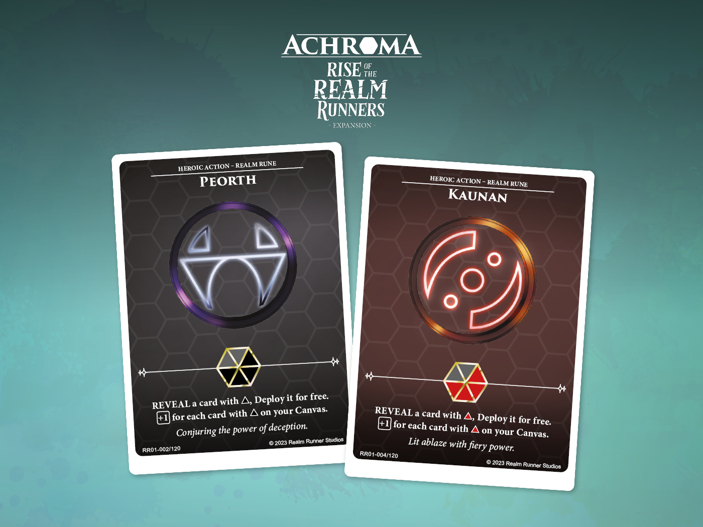 Peorth and Kaunan continue the realm rune precedent set by Algiz and Isaz in that they are rare realmless actions that let you play a REVEALed card for free and give you +1 for each card with that Δ colour (yes, I’m using the Greek symbol delta, Δ, for shard) on your canvas. These are strong cards that are likely to see play in the right deck. I can already see myself including Kaunan in a fairy deck with Firetender and Lava Fountain. The slightly surprising thing here is that Peorth breaks the mould and is an achrom card with a gain effect rather than a drain effect like Achrom Breach.