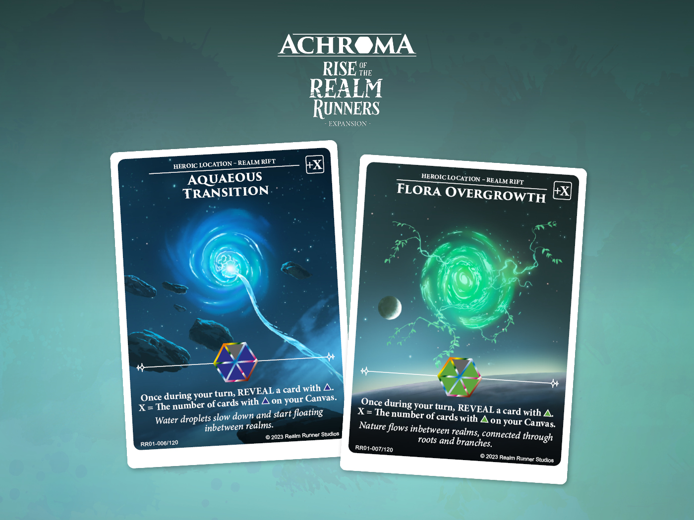 Aquaeous Transition and Flora Overgrowth continue the realm rift trend set by Orium Fracture: legendary locations that give you a once per turn REVEAL, meaning you are playing with 1 more card each turn of the right colour, and you get a once per turn gain equal to the number of cards of that colour on your canvas.