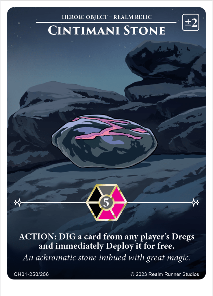 A particularly fun combo I like it using Hex Clunker to FIND this card and play it on an opponent’s character, then use the Stone to DIG for a Corrupted Muon Trap (or Otrix) and claim that character. Then I’m essentially giving the Corrupted Muon Trap 5Δ of health AND if they do manage to erase my Cintimani Stone or Muon Trap I can just DIG it with my Clunker and rinse and repeat next turn. I’ll definitely also consider Mystical Malfunction here to erase my own Cintimani Stone just to DIG it again, though that might be a bit contrived. Note you can do this midway through the resolve phase: resolve the Stone, Malfunction it, DIG and deploy it again for free with the Clunker, DIG and play another card for free from any dregs, and resolve the Stone again and whatever that other card was.