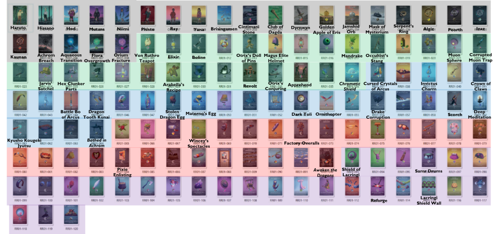 The complete Rise of the Realm Runners set got teased by achroma yesterday. And by teased, I mean an image with such poor resolution it’s almost impossible to get anything out of it. That aside, I thought I’d try. I’ve put the names of the cards spoiled on there, and colour coded by realm, with the grey at the top being realmless, followed by Salum Planum, Draco Planum, Spirata Planum, and Norso Planum: