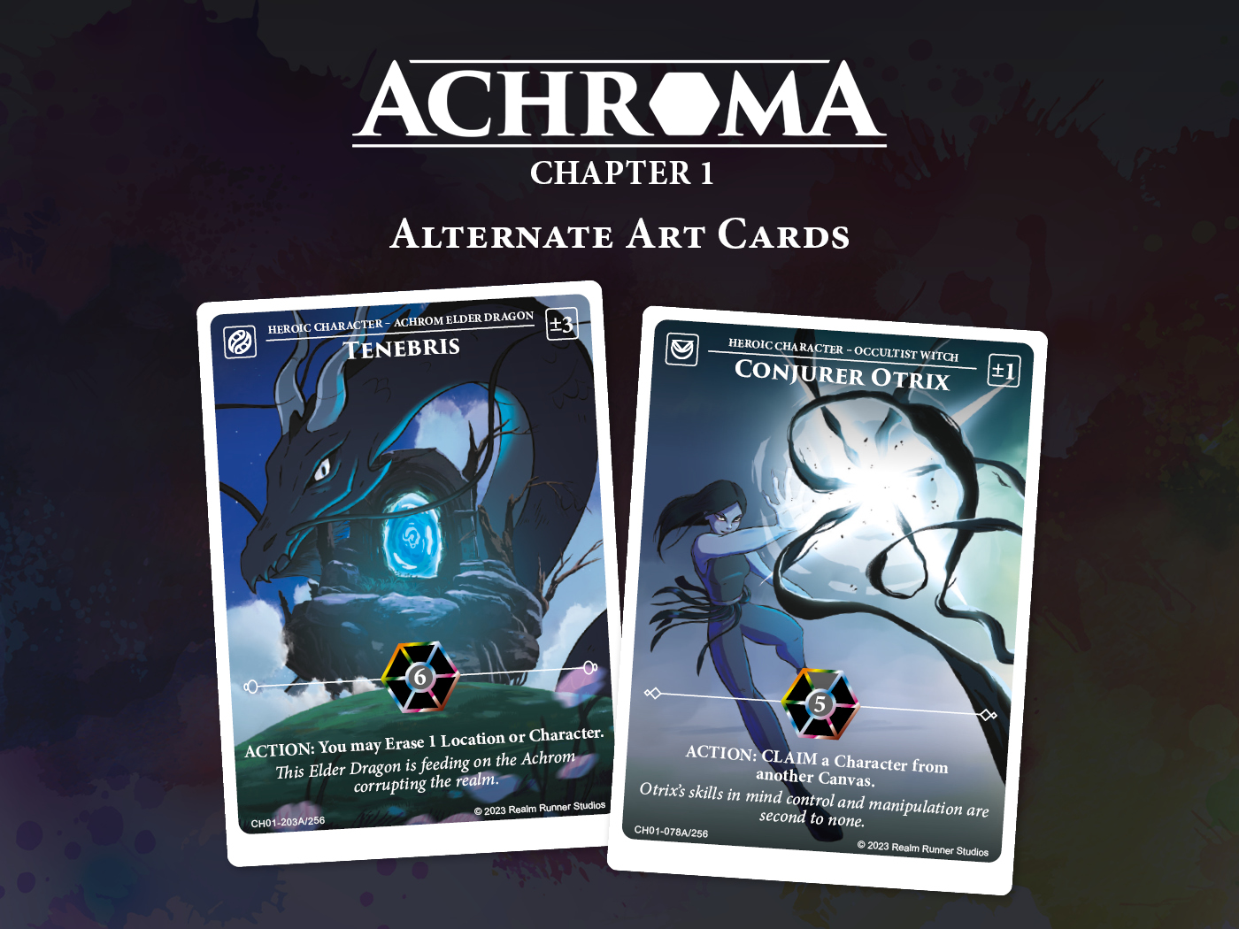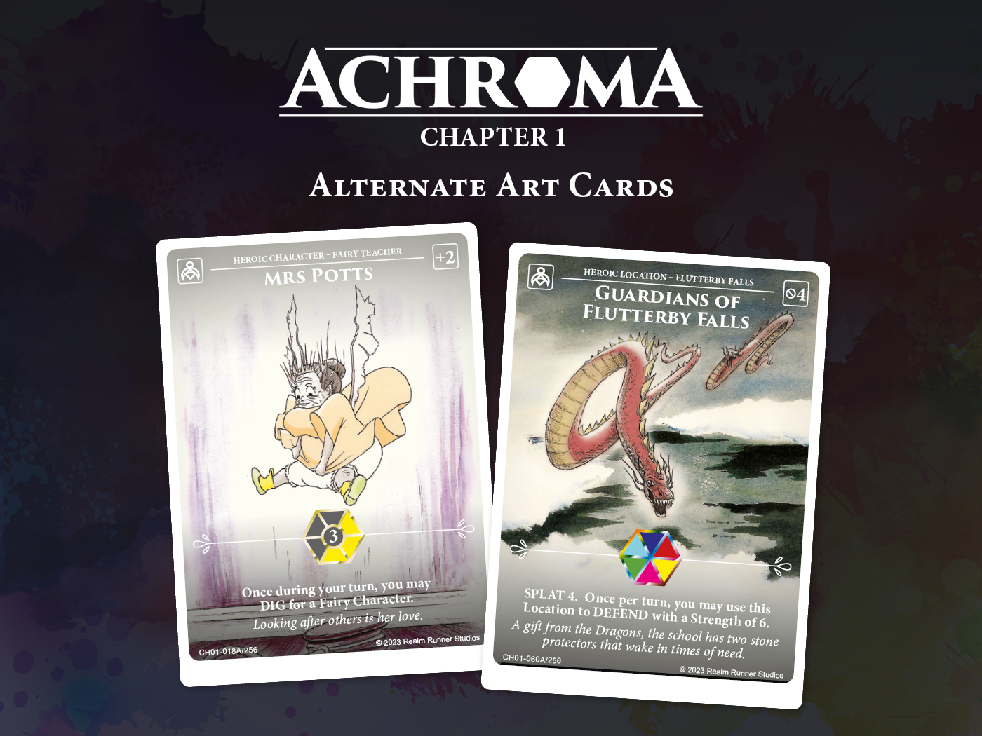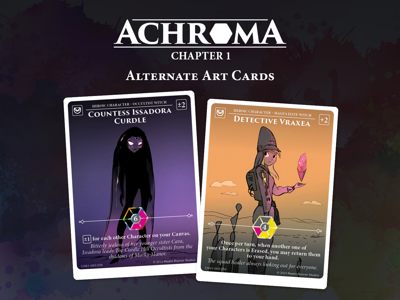 As part of achroma‘s kickstarter campaign, there will be 48 new alternate art cards from Chapter 1. One of the great things about this, other than the fact that they look amazing, is that players can use these cards to double up on legendaries for heroes mode, or just have more decks built at once without having to swap cards around. The list of cards that will have alt arts has been released, and here they are: