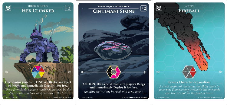 Now we have two solid ways of looking at how good a card is before putting them into your chroma deck! The next important thing to consider are any abilities a card has. If we take a card like Hex Clunker it costs 6Δ and only gives you 2Δ a turn, so it has a 3 turn ROI, and with that +2Δ gain it gets you 7% profit. If we look at just these two values Hex Clunker doesn’t seem to have very good value. However, it has the incredible ability to FIND or DIG for an object and deploy it for free. This ability has the potential to be obscene, especially when Rise of the Realm Runners arrives. Let’s take the Cintimani Stone which is coming out soon. You can not only find this 5Δ card and throw it out for free, you can then use its ability to DIG for a card and play that card for free. A combo I am looking forward to using is throwing a Fireball at one enemy character, then using Hex Clunker to dig/find the Stone, attaching it to another enemy character and using the action off that to recast your Fireball onto the character holding the stone ending with both Stone and Fireball in your dregs ready to do the same again next turn!