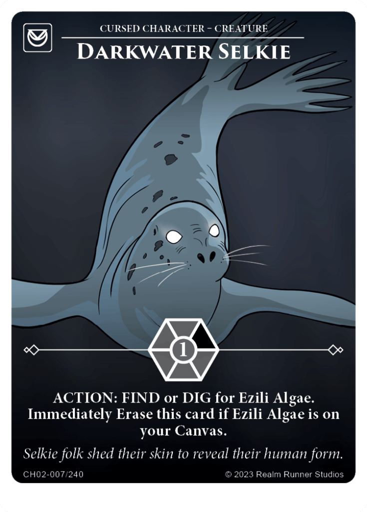 Selkies are mythological creatures from Celtic and Norse traditions, but feature especially prominently in Scottish mythology. They have the ability to change between seal and human form, and this is played out very well in our Selkie card duo: Darkwater Selkie and Ezili Algae.