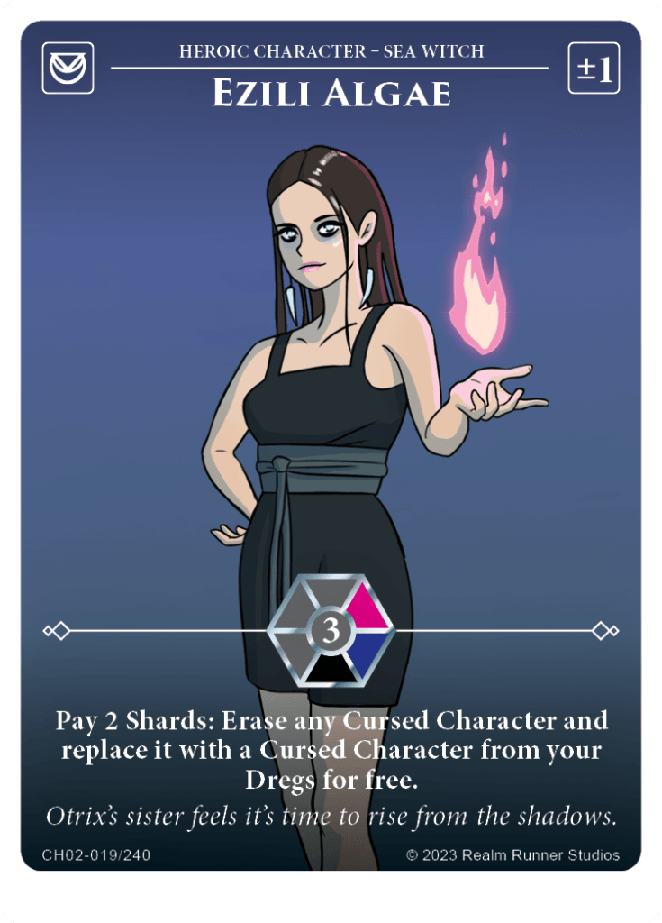 Ezili Algae is a 3Δ steal 1 Sea witch with a once per turn ability: Pay 2 Shards and Erase any Cursed character and replace it with a Cursed Character from your Dregs for free. As you will likely have the Darkwater Selkie in your dregs at the time, this means you can swap out an opponent’s character for a 1Δ seal with no resolve, which is quite nice. You won’t get to ACTION the Selkie to FIND another Ezili though, as you aren’t deploying the card.