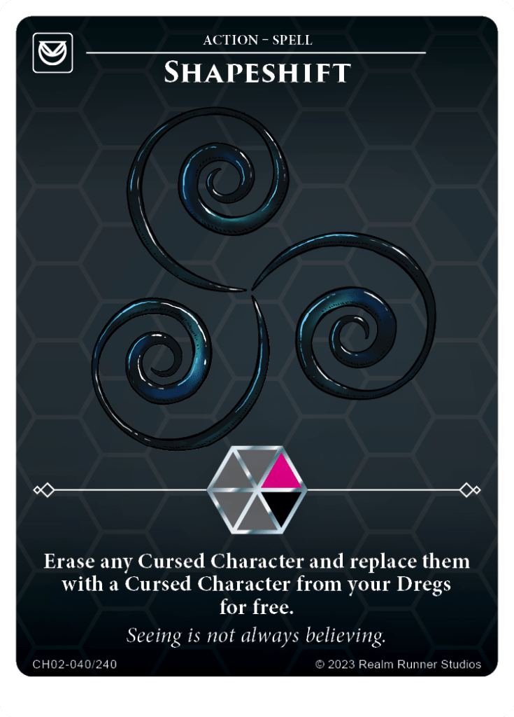 Shapeshift is an odd ability, if just because it’s a carbon copy of Ezili Algae‘s ability. As before, this is a nice way of dealing with opponent’s problematic characters, especially those with “cannot be attacked” abilities. Also as before, time will tell if there’s any mileage in using this card to upgrade your own characters.