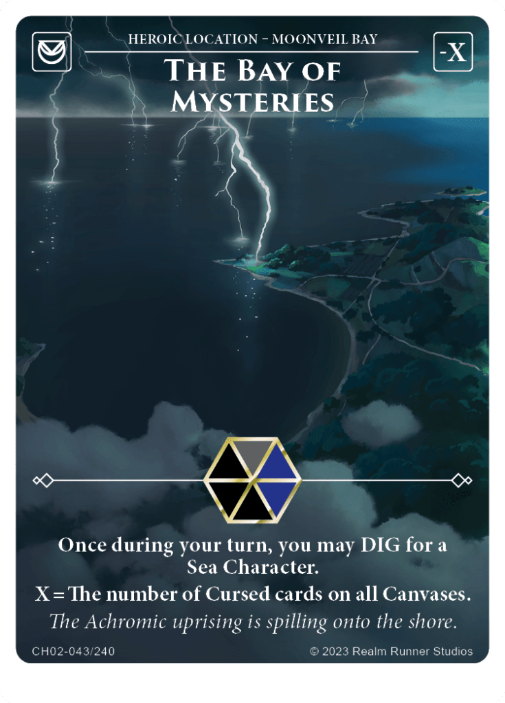 Once per turn, you can Pay 2 shards to CURSE and CLAIM a Character, with that character returning to their owner’s canvas at the end of the turn still Cursed. This is an incredibly strong ability, especially given the recent rules change around CLAIM that means you can CLAIM a character, then immediately attack with it against an opponent’s character. Even if you don’t attack with it, you can Resolve that character, and it returns CURSED allowing you to trigger other abilities off it, such as our next card, The Bay of Mysteries. Also, it’s worth noting that this is a great antidote to CLAIM. If the opponent has claimed your character, then claim it back with Otrix, and at the end of the turn, since you are the owner of the Character, you keep them.