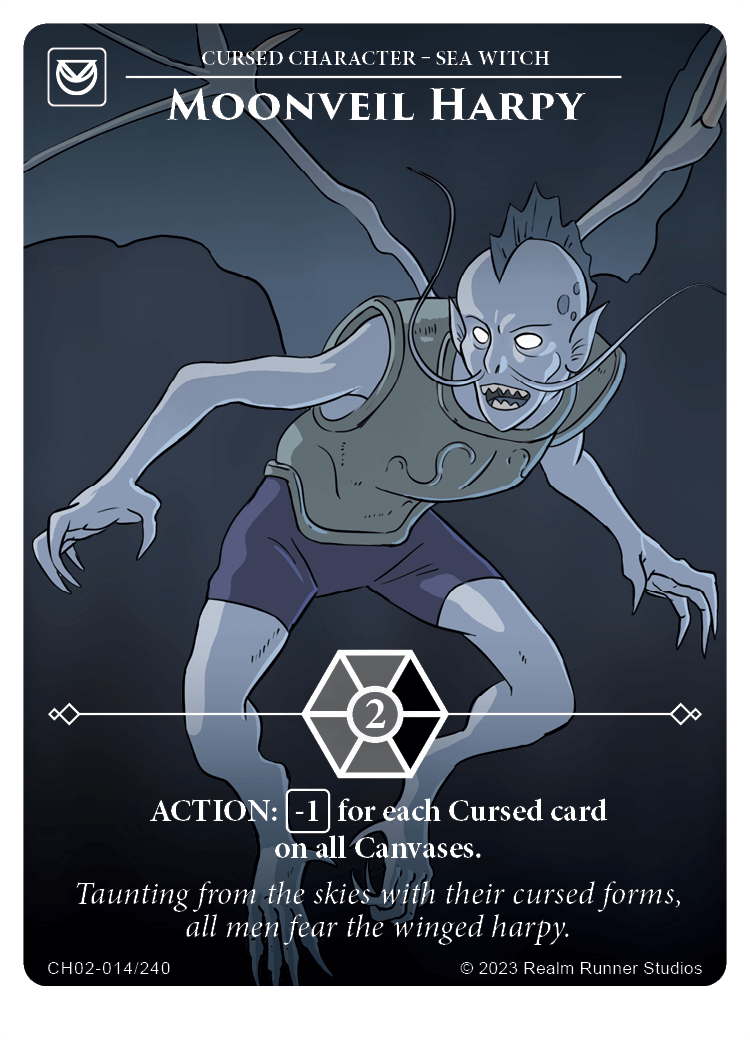 Moonveil Harpy might seem like a bit of a weird choice, but she has a very high ceiling for just 2Δ. She’s always a -1, since she counts herself, and if you’ve played Dark Rainbow, or have a Servant of the Sirens or another Harpy on your canvas already, it can represent a sudden burst of achrom that can cripple and surprise a lot of decks.