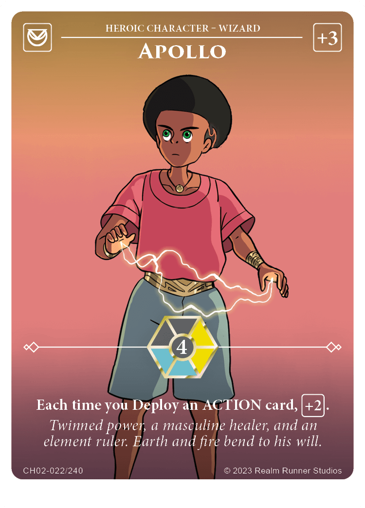 I tend to build pretty action heavy decks, so Apollo has been making a number of decklists lately as a go-to chroma character. Most turns you play him you’ll be netting a least 1Δ as you’ll probably play an action. Yes, he’s rare, so is fighting with a lot of good cards, but I love him, and think he’s better than his twin sister Asa, if just because he’s rare not legendary.
