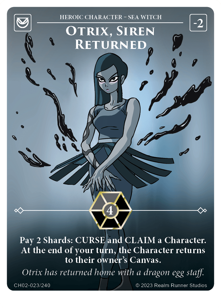 I’ll always have a soft spot for Otrix, but I do love this new iteration of her. Not many Salum cards have a built in -2, and her ability has proven to be surprisingly useful. It’s normally a way of erasing at least one of opponent’s character as you can immediately attack with it, often dispatching two characters, but it can also be used for additional drain or gain if the opponent has the right characters on their canvas. Especially powerful against splat or squish. For instance, claim Copper Joss, splat Otrix for +3, then attack with Joss, erasing her and still gaining +3 in your resolve step.