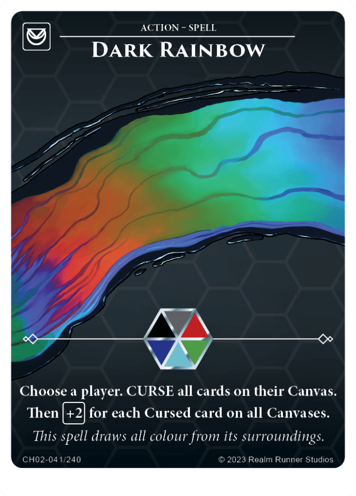 OK, so it’s a bit situational, and a lot of the strength of this absurd combo comes down to how OP Cintimani Stone is, but that aside, this card is amazing. It’s almost worth including Occultist’s Stang in your deck just to pull this card. An interesting comparison is with Tankards, which costs 2Δ and is +1 for each card on your canvas. Tankards is therefore also worth +1 when you have 3 cards on your canvas, but Dark Rainbow then ramps up much faster and can target all canvases, not just yours. Unless you actually can’t afford 5Δ, or you’re worried about the opponent playing their Dark Rainbow next turn, this card is objectively better than Tankards.