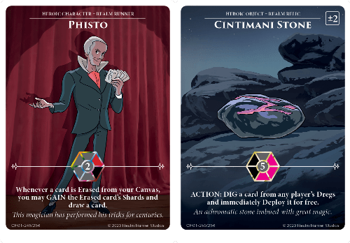 At this point, you do not check the heroic rule, as StoneB‘s ACTION has just fired and needs to complete first. This is similar to what happens if you play a Chromatic Storehouse when you already have one on your canvas. If you checked heroic rule first, StoneB could go to your dregs and you could play it again creating an infinite loop. Thankfully, the heroic rule waits for you to finish resolving ACTIONS, so you play another card from any dregs. If there is a third Stone out there, great, but otherwise, just play a high value card.