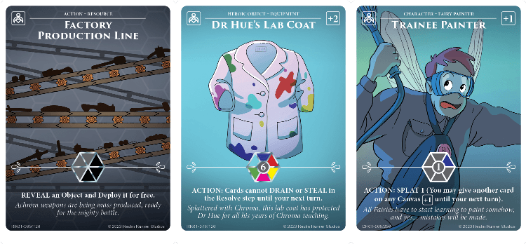 One of the most effective ways of picking off the opponent’s characters is to surprise them with a powerful object deployed to a character already on the canvas. However, this only works if your character was deployed in a previous turn, and you kept the object in your hand. If you’re holding a Factory Production Line or a Dr Hue’s Lab Coat, then play that Trainee Painter now, even if it means you miss out on the ACTION: SPLAT 1.