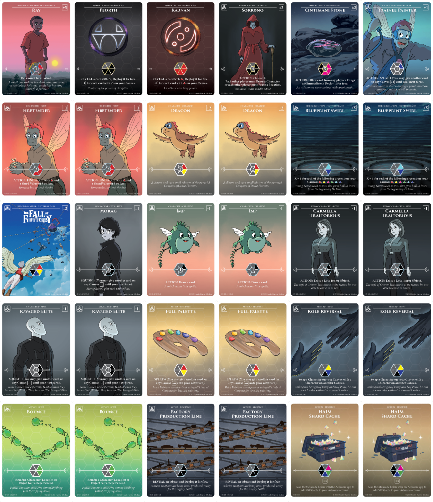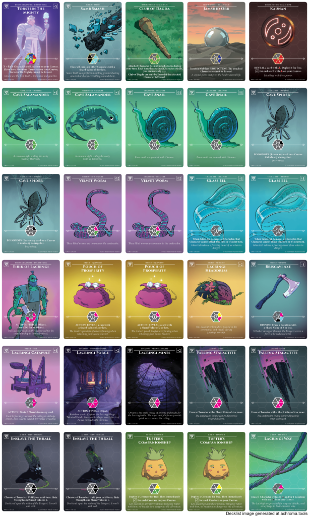 It’s a Pixies/Rayders crossover, coming in at exactly 80 points. Including 2 runes: Kaunan for Dracon/Full Palette/Firetender/Ray/Fall of Flutterby promo, and Peorth for all the achrom. It features the Blueprint Swirl/Dracon combo, but sadly has to miss out on Dr Hue’s Labcoat. It features Factory Production Line and Cintimani Stone, one of the best combos in the game, so I couldn’t resist retaining 2 copies of HAIM Shard Cache for some swingy double plays. And finally it features Bounce, mostly because I wanted a decent cheap control card to round out the build.