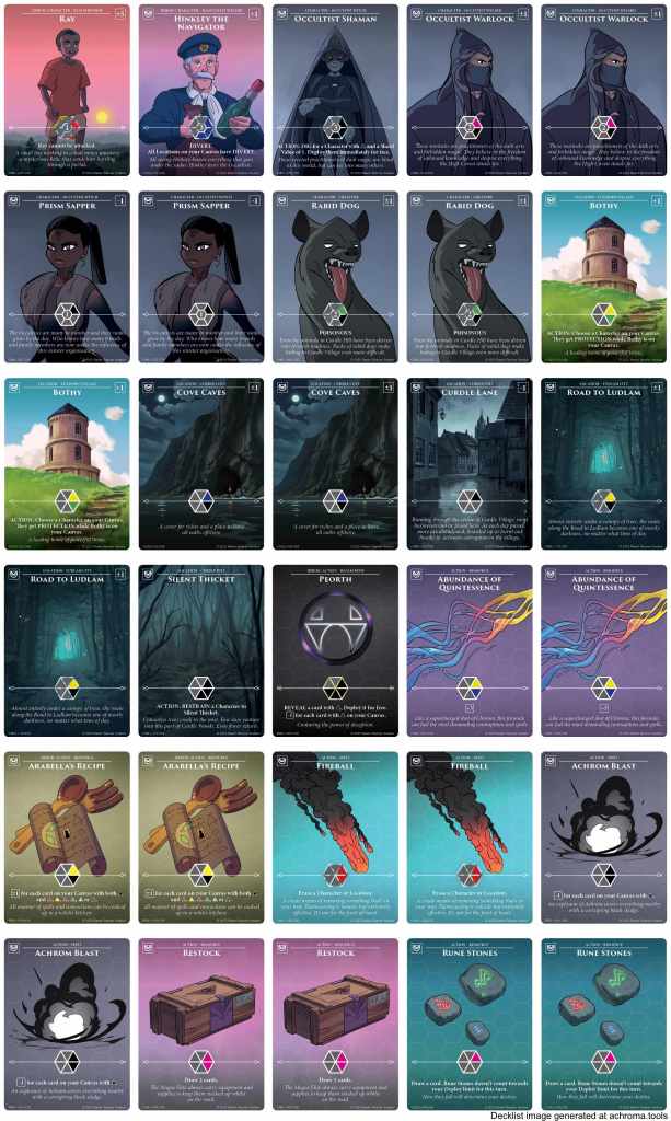Arabella’s Recipe and Achrom Blast offer burst damage, and naturally encourage you to build with a lot of cheap achrom cards, like Occultist Warlock, Rabid Dog, Cove Caves and Road to Ludlam, as well as Prism Sapper and Curdle Lane. Bothy and Hinkley are there to protect Ray, but if it were me, I’d drop these. There’s no tech for finding Ray, so in most games these are likely to be dead cards in a deck of cheap cards. I’d be tempted to swap them out for more achrom, preferably Cintimani Stone plus Alchemist’s Tincture and Corrupted Muon Trap. This would up the shard count a little, so does go against the spirit of the build, but would offer some powerful control, more cards for Arabella’s Recipe, and it’d still sit comfortably below the 80 mark. It would also offer a way of dealing with big characters as decks with just small characters tend to struggle against decks that like attacking.