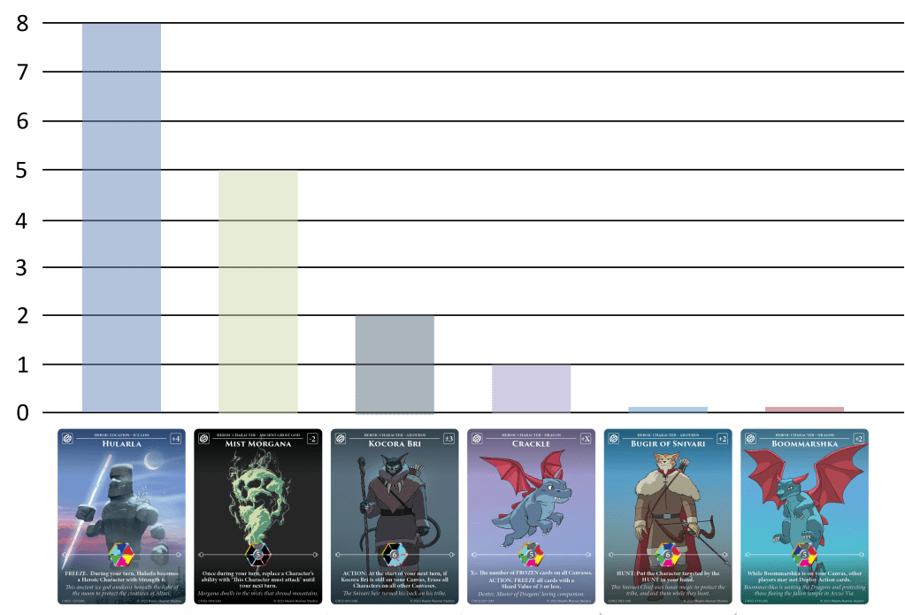 Clearly there is a lot of love for Hularla. At +4, this is one of the highest gain cards in the game, and with the advantage that the ice god can attack but cannot be attacked by opponents, plus the once per turn FREEZE, it’s not much of a surprise that this tops our ranks. Mist Morgana comes in at a closeish second, and while I don’t think this card is especially consistently powerful, it is a lot of fun. Kocora Bri gets only 2 votes, which may reflect the fact that he is just a solid character, and nothing particularly out of the ordinary.