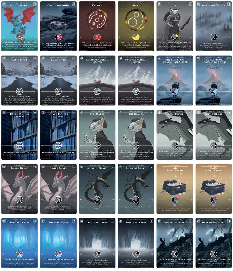I’ve got a wide suite of steal locations, but not the Siege of Draco Temple, because that has a red shard. I’ve got two key Freeze locations, The Valli Caves and Blizzari Plains, plus a few strong drakes. Finally, I have The Reader and Draco Planum Library which make quite a nice combo to draw key cards mid-turn, or I can use The Reader on the opponent’s deck for a bit of extra control. Wolfgang Woods is there because a bit threat to Boomer is attacks, plus Cintimani, HAIM and Draco Graveyard for good tech.