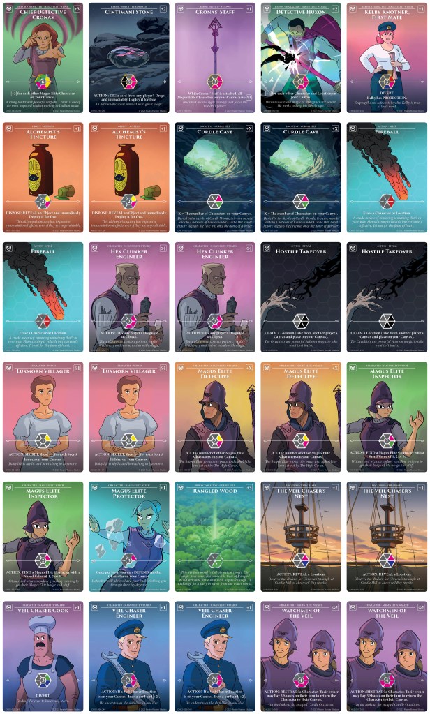 This palette uses Magus Elite characters, like Chief Detective Cronas, Magus Elite Inspector, Magus Elite Detective, Protector, Veil Chaser Engineer, Hex Clunker Engineer, Watchmen of the Veil, Cook, Kelby, and of course Huxon, combined with Cronas’ Staff to up your prevent and help generate a large gain. I’ve included Alchemist’s Tincture to pull either the Staff or Cintimani Stone. Note that I have included Hostile Takeover as this is still a great card despite the +1 shard cost. Finally, I’ve included Luxmorn Villager, because why not?