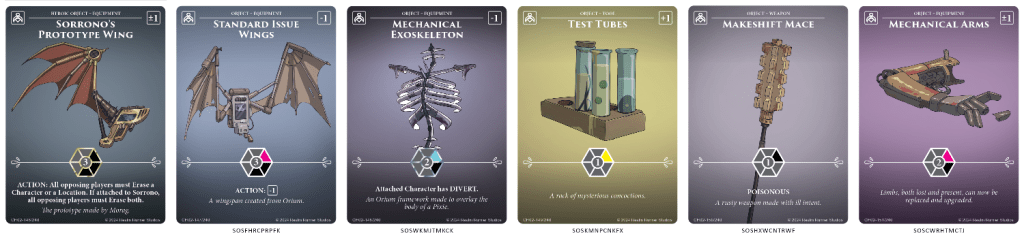 Given the entire pixie faction revolves around objects, it’s unsurprising most of these are achrom heavy. I like that Sorrono’s Wing keeps up the OG Sorrono mechanic, though this rare is going to struggle to make the cut in competitive play. The Standard Issue Wings meanwhile are a nice card, even if they look very weak alongside Factory Overalls. My favourite card though is Mechanical Exoskeleton. As well as triggering Mechanical Pixie Grunt, it contains the evergreen DIVERT keyword, which I’m glad has seen a reappearance in this expansion.