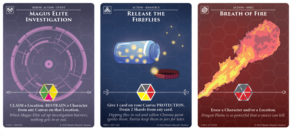 This “do as much as possible” ruling also applies to Action cards. You used to be able to play Magus Elite Investigation to claim a location without restraining a character, if for example you were the only player with characters on the canvas. You could play Release the Fireflies to give a card PROTECTION without having to drain a card of shards; worth doing if you were the only player with cards out. Overall, this is a relatively minor but very welcome change, as it gives clarity and consistency to Actions in general. It also has no effect on cards like Breath of Fire which say and/or, giving the option to erase one or the other or location or character.