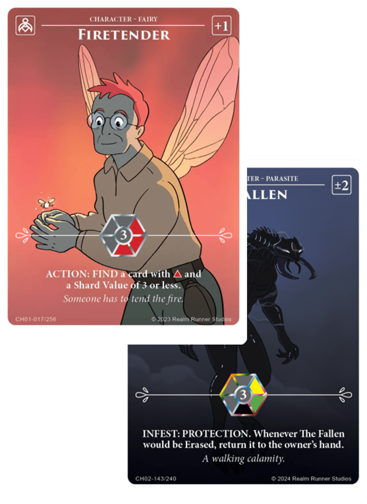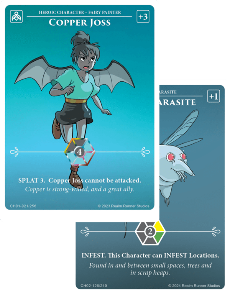 When you deploy a Character with INFEST, you may choose to either pay the full Shard Value to deploy it as a Character on your own Canvas, or only pay 1 Shard to INFEST another Character on any Canvas; attaching the INFEST Character to another Character. While attached the INFEST card does not take part in combat, instead the INFESTED card does.