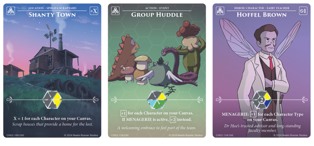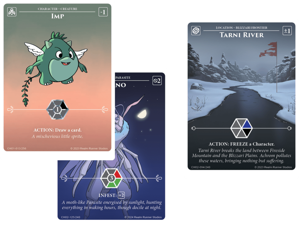In this case, it’ll cost you 3 shards for Cordyceps then 6 shards for Nella. You resolve her ACTION first, drawing 2 cards (you have a revived and a parasite) on your canvas, before Cordyceps infests her, meaning you gain 6 shards. The Imp costs 1, you draw a card, then gain 1 shard back as Cordyceps infests the Imp. MENAGERIE is now active, so you can immediately +3 from Nella. When you resolve you gain +2 from Nella and +2 from Cordyceps, but the Imp has no Achroma effect to resolve. Overall, you’re +4 shards for the turn.