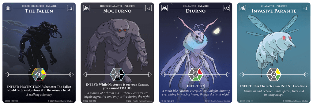 It’s also worth re-iterating that INFEST abilities can only be used when the parasite is actually INFESTING a character. You don’t get the +2 from Diurno unless it’s INFESTING. The Fallen doesn’t have PROTECTION if you play it as a character (though it will return to your hand if erased as this is not part of the INFEST effect). You also don’t have a trade embargo on you if you play Nocturno as a 2 shard character on your own canvas.
