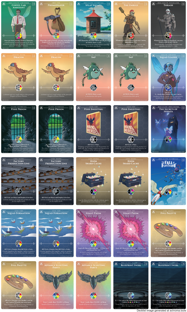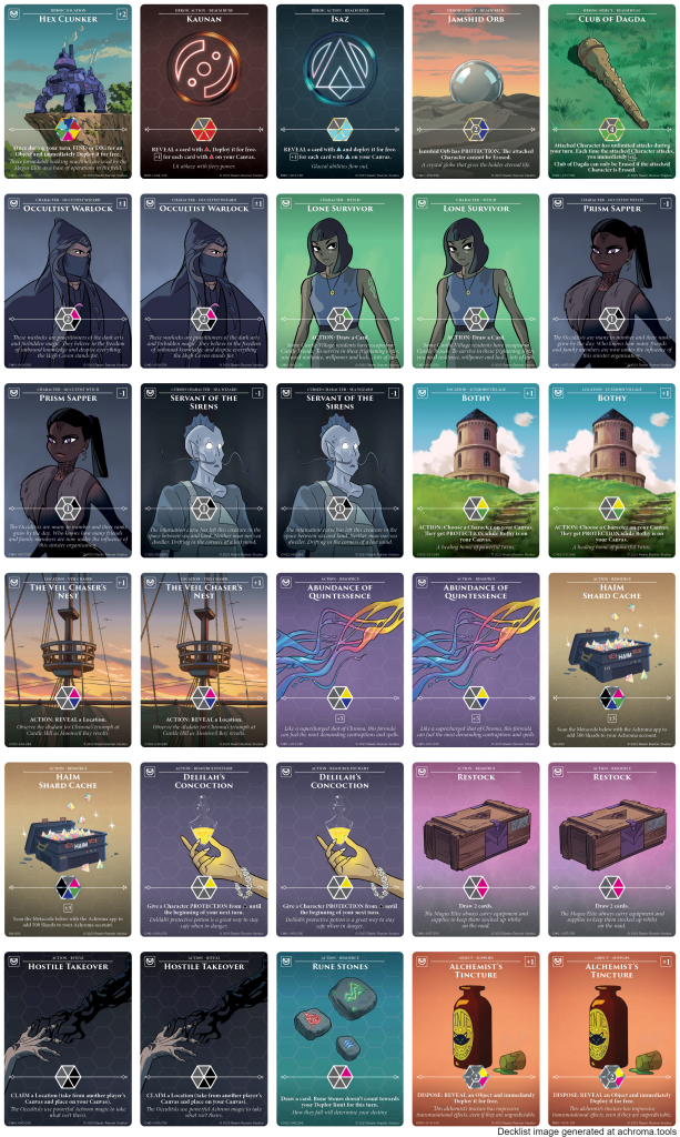 This combo also sits quite nicely in Salum Planum. The realm has ways of finding objects (Hex Clunker and Alchemist’s Tincture being the big two) and protecting characters (for example Bothy, which can be revealed by Veil Chaser’s Nest). Here’s a prototype build that utilises these combos, with plenty of cheap achrom characters so you can protect the opponent’s character with Delilah’s Concoction: