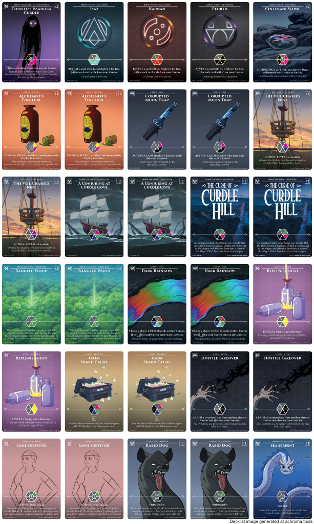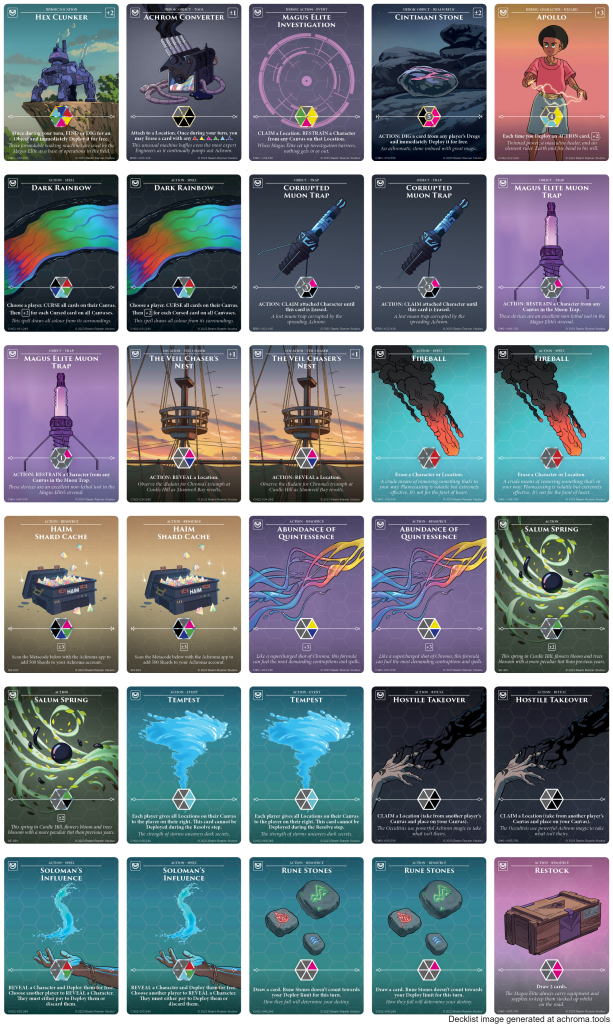 One final thing I’d add is don’t underestimate Replenishment or The Veil Chaser’s Nest. I’ve deliberately skipped Abundance of Quintessence, so that Replenishment will always hit Alchemist’s Tincture and either another Replenishment or HAIM Shard Cache. Play Replenishment before you trade, trade the HAIM, play the Tincture, and you’re still up 1 shard and have set up for either Corrupted Muon Trap or Cintimani Stone. Similarly, the Nest will always hit either another Nest, a promo location, or the amazing value Rangled Wood. Whatever happens, you’ll probably end up with 2 cards on your canvas out of 1 card from hand, which is what you need when you’re trying to Rainbow your way to victory.