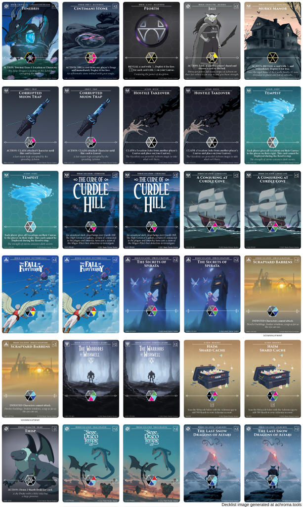 The ultimate promo achrom deck; nothing really beats the promo locations for raw power in an uncommon, so as such I have 2 copies of all 9 promo locations, plus Scrapyard Barrens, making up 20 cards of my deck.