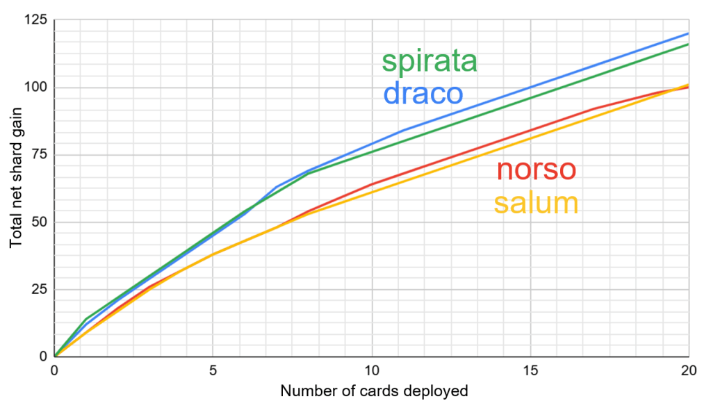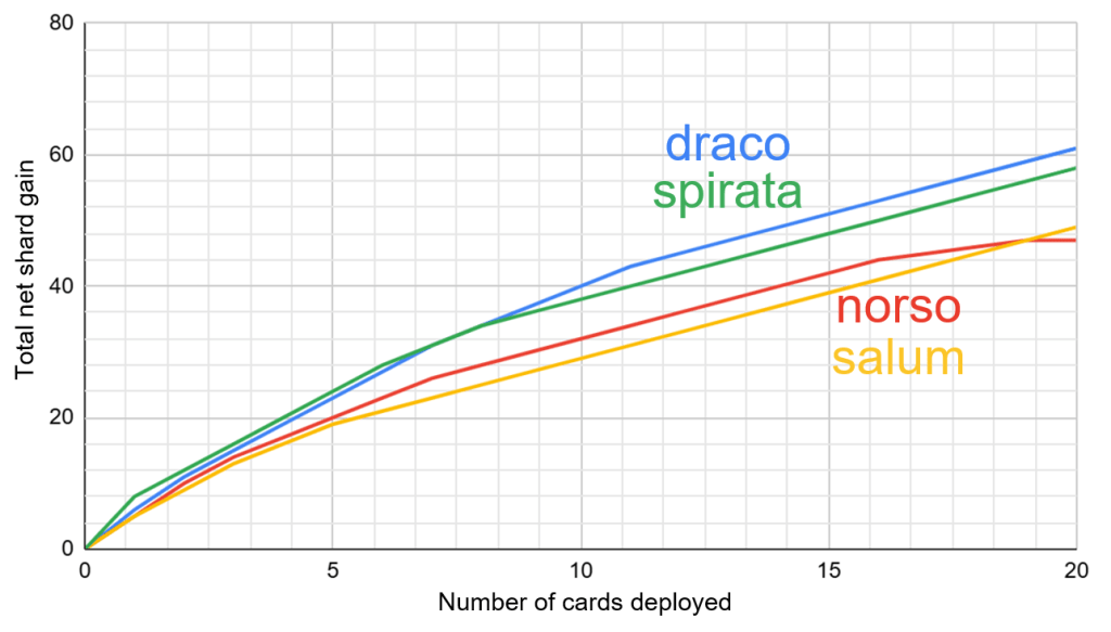 The results are in a graph. Along the x-axis is number of cards played, starting from the best value cards down to the 20th best value card in that realm. Up the y-axis is how many shards you would be on after 2 turns if you played all those cards. Obviously you can’t play 20 cards in one turn. But the effect of comparing data in this way is it shows you the relative value of the best cards in each realm, even if the actual absolute values don’t reflect a genuine game of Achroma.