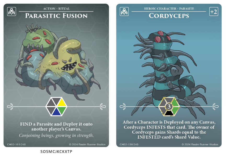 This means that Parasitic Fusion has instantly become a much more playable card. You can now use it to deploy Cordyceps (for 3 more shards) on the opponent’s canvas, then play an expensive character with a good resolve/ability from your hand and claim back the shards, and then play a cheap character for Cordyceps to INFEST instead, all in the same turn.