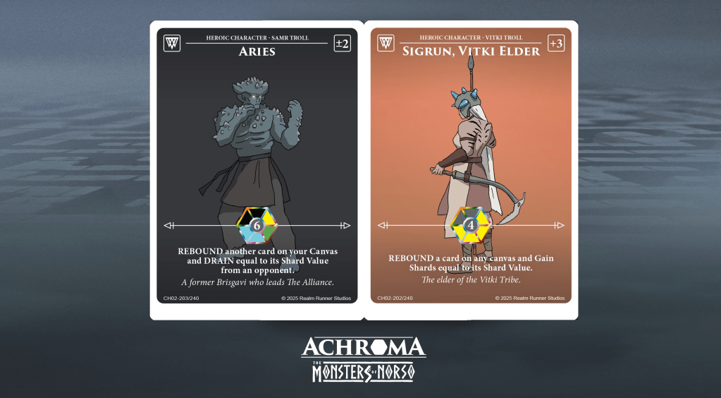 Sigrun is a Vitki Troll which costs a mere 4Δ for a +3 Achroma effect, but again the ability is unreal, and is like the mirror image of Aries, except maybe stronger as you can use it for control. REBOUND a card on any Canvas, and you Gain Shards equal to its Shard Value. So if the opponent has shelled out for their 6Δ legendary, you can bounce it for go +6. Even better if its carrying an object. Also, unlike Aries, Sigrun doesn’t specify another card, meaning she can target herself. This means you can REBOUND her every single turn to net +3 Shards, as of course you only ever are going to be using these abilities after you’ve resolved the REBOUND card.