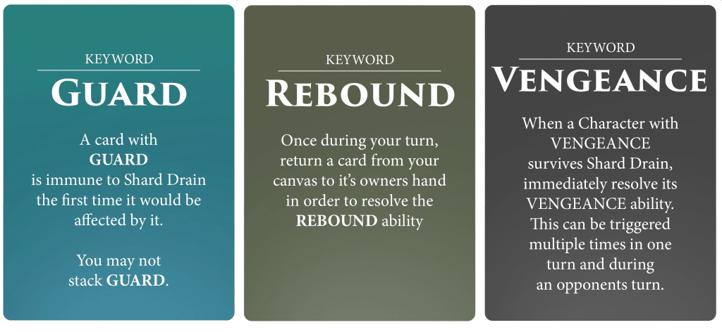 Before I get on to the new keywords and what they mean, I have to define a new concept from the Rules reference, Shard Drain, which is, “The act of reducing a card’s Shards in its Hex through attacking, erasure, or ‘Draining Shards’ through abilities. Not to be confused with reducing a card’s Shard Value.”