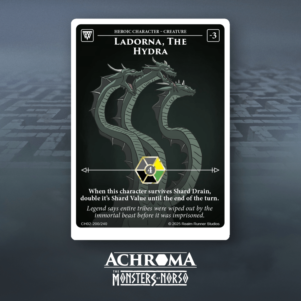 Ladorna, the Hydra is a 4Δ achrom creature with a very strong -3 resolve. In fact, we’ve only ever had 3 characters in the game with a 3 drain/steal Achroma effect, and they have all cost 6Δ (Tenebris, Kocora Bri, and Pearl). This makes this a very effective drain engine for an aggressive achrom palette.