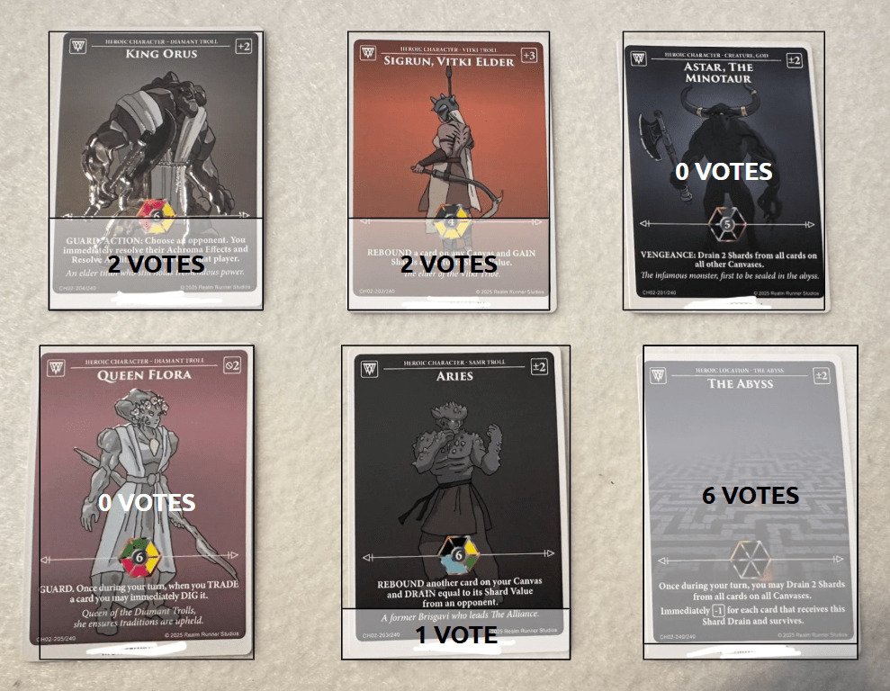 All the Monsters of Norso cards have finally arrived at Five Realms Gaming in Poole, and cards are getting shipped out tonight or tomorrow. To celebrate, let’s have a look again at the 6 legendaries from the set. I ran a poll on discord to see which people are most excited about playing, and I’ve put the numbers of votes over the characters: