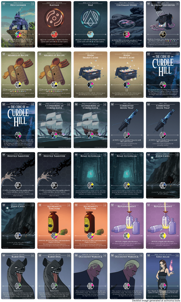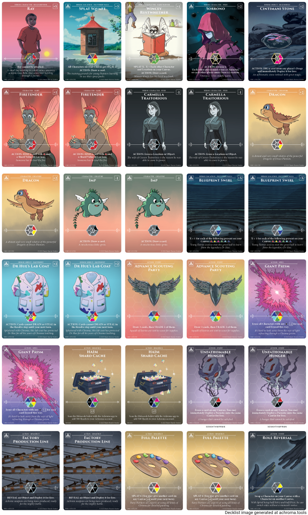 The most dominant palette in Achroma history, this deck resulted in a fundamental change to the way the game is played, the 6Δ trading cap. It did previously suffer from the restriction that Ray could only have one copy of Firetender and Full Palette, but the restricted list has been removed from the Achroma website, and was never enshrined in the rules, so appears to no longer apply, which is probably fair. As such, here is my current Rayders build: