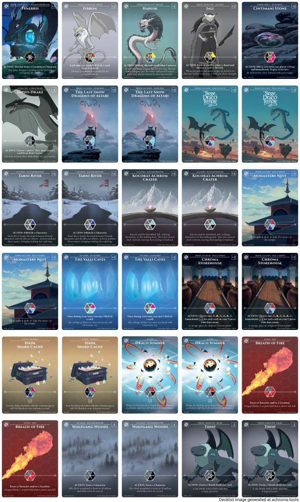 I’ve made a few revisions since this palette was unveiled. I’ve swapped Kocora for Tenebris, Chromatic Extinction for Cintimani Stone,Chroma Overflow for Impius Drake, and Ice Falls/Summon the Mist for Draco Summer/Thisp. In other words, this is a much more aggressive build to maximise control and drain/steal.